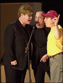 Elton John, left, performs with singers Billy Joel, center and Paul Simon during the finale of "An All-Star Tribute to Brian Wilson" concert, March 29, 2001, at New York's Radio City Music Hall. (Photo: AP)